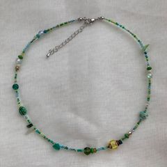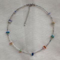 テグスを何重にも通すことでなみなみのウェーブを描くアクセサリーを作りました。光が織りなす色に着目しそれをなみなみの中で表現した一点物です。