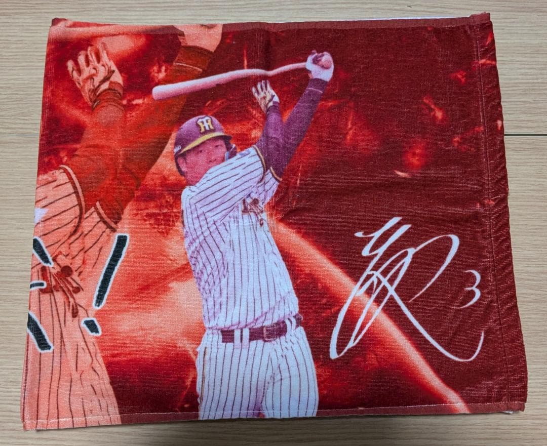 阪神タイガースの大山悠輔選手のタオル、赤色でサイン入りデザイン。