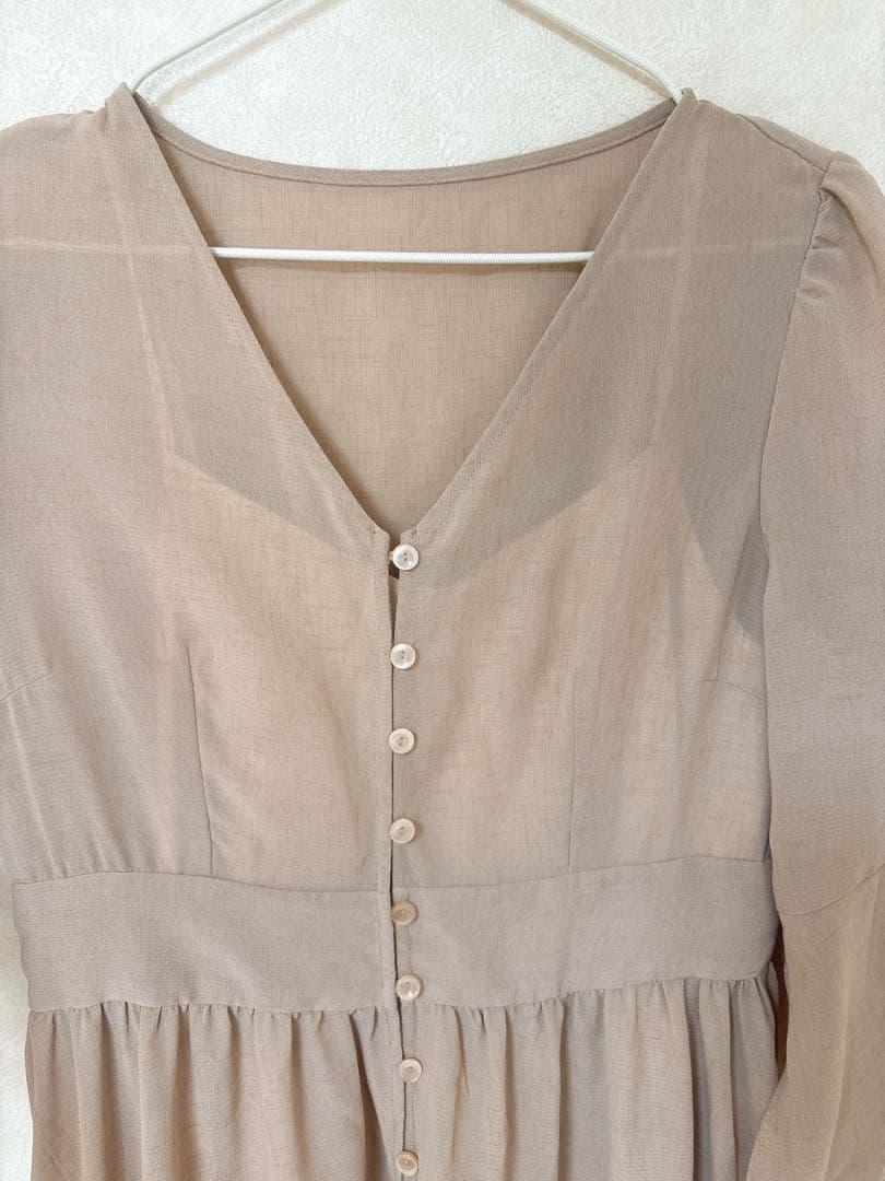 Vネックデザインのベージュシャツワンピース、フレアスリーブとボタン付きでエレガントな印象。