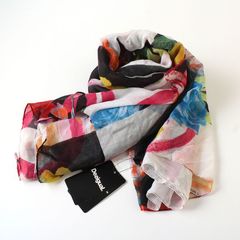 リゾート ボヘミアン エスニック エキゾチック ボーホー ユーロシック 古着小物 Desigual デシグアル クジャク 孔雀 花柄 ボタニカル 英字 プリント 総柄 シアー 大判ストール 緑 FOULARD