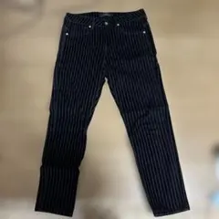 スリムフィットデザインのブラックパンツ、サイドにレッドとホワイトのストライプ付き。