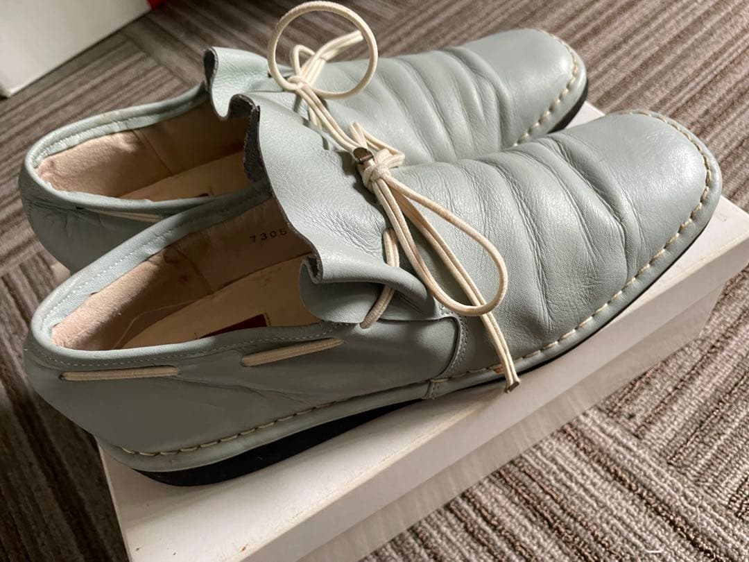 柔らかいレザー素材のライトブルーのフラットシューズ、ひも付きデザインで履きやすいです
