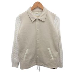 このフード付きニットジャケットは、クリーム色を基調にしたカラフルな配色が特徴です。紫、緑、ピンクのアクセントがあり、カジュアルなスタイルにぴったりです。