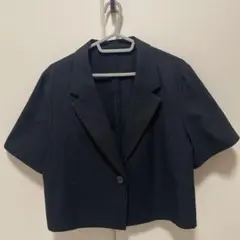 ネイビーのダブルブレストテーラードジャケット、ゴールドボタン付き、ポリエステル100%素材。