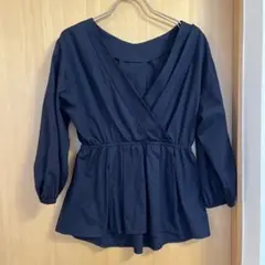 ・青と白のストライプデザインの五分袖シャツ。リボン付きの袖が特徴。また、袖にスリットが入っているので二の腕も隠しつつ肌見せもできるので可愛いです。