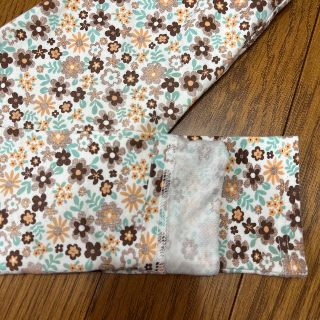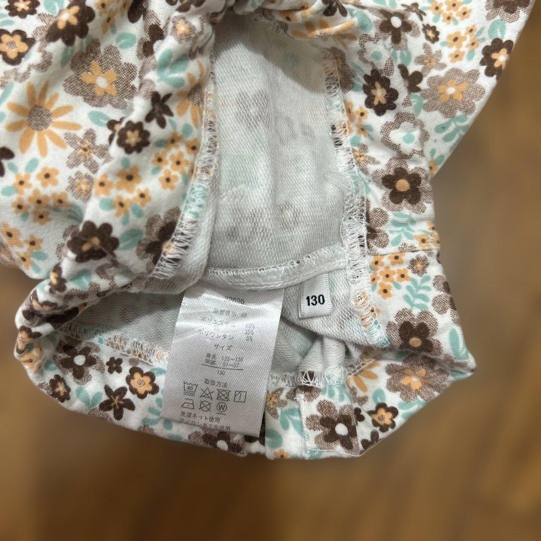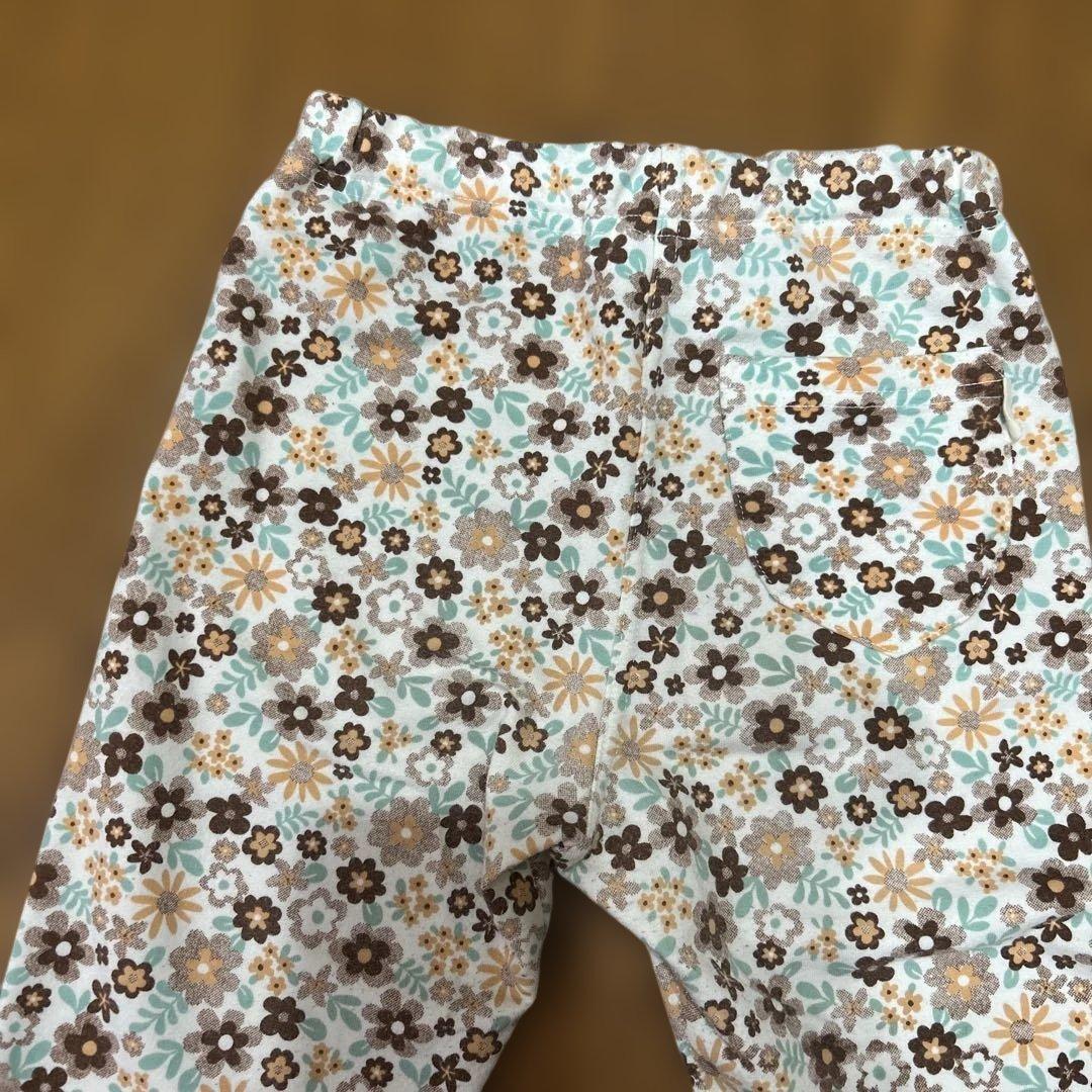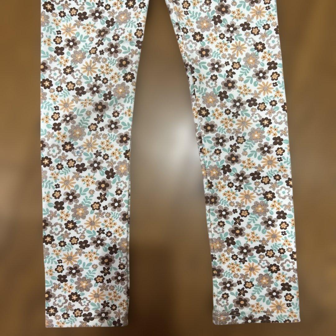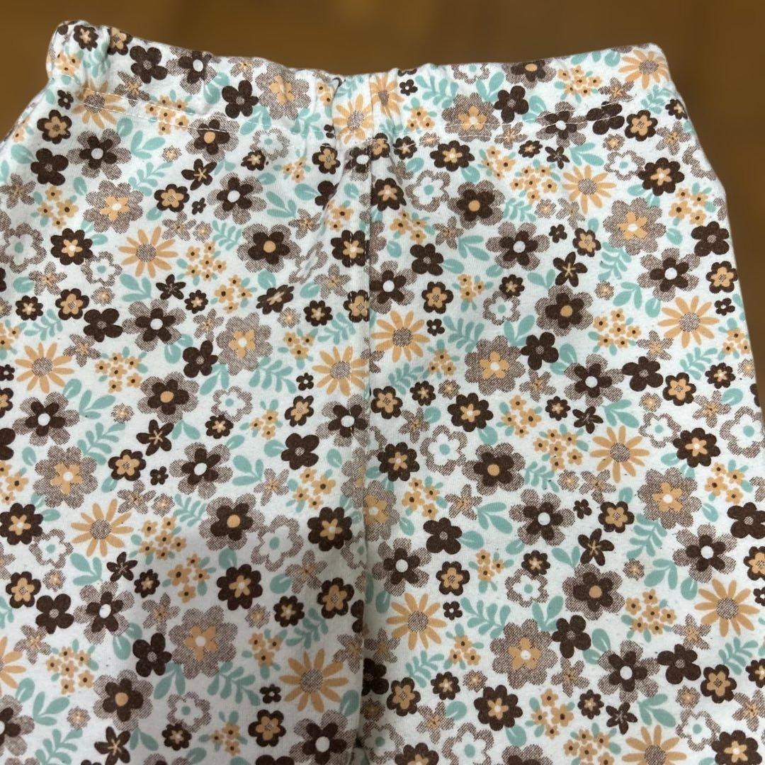 水色ベースの花柄長ズボン、ゴムウエストで快適な着用感。
