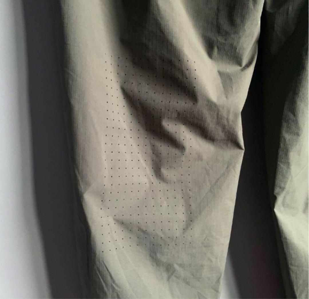 アダルトオリエンテッドローブス 22AWのリップストップナイロンのトラックパンツ です。さらっとした薄手の生地で、メッシュライニング付き。膝の部分は生地を重ねるだけでステッチを入れていない仕様です。裾はジップ開閉でシルエットの調節可能。ウエストはゴム&コードのイージーパンツ仕様です。左足にネーム刺繍、左足後ろ部分にアイコニックデザインのパンチングがはいっています。