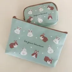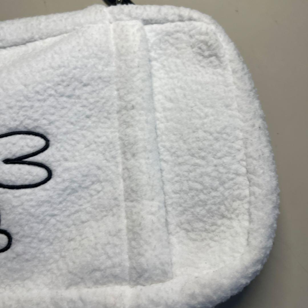 フリース素材のホワイトポーチにうさぎの刺繍が施されています。