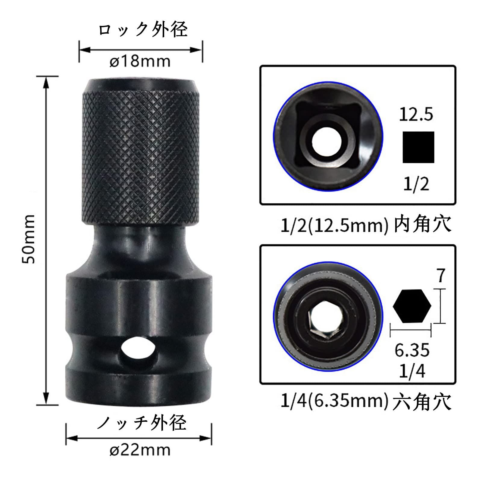 【商品仕様】1/2(12.5 mm)四角-1/4(6.35 mm六角)ソケットアダプタ*1、カラー*1、ピン*1。
