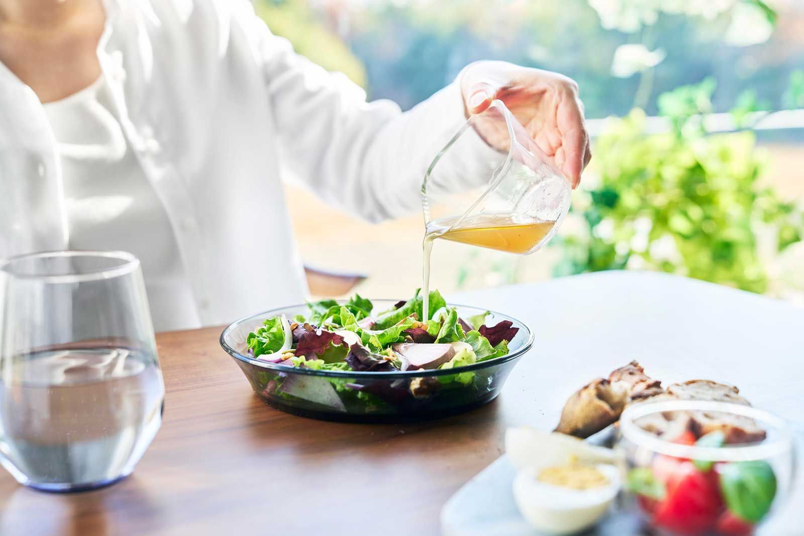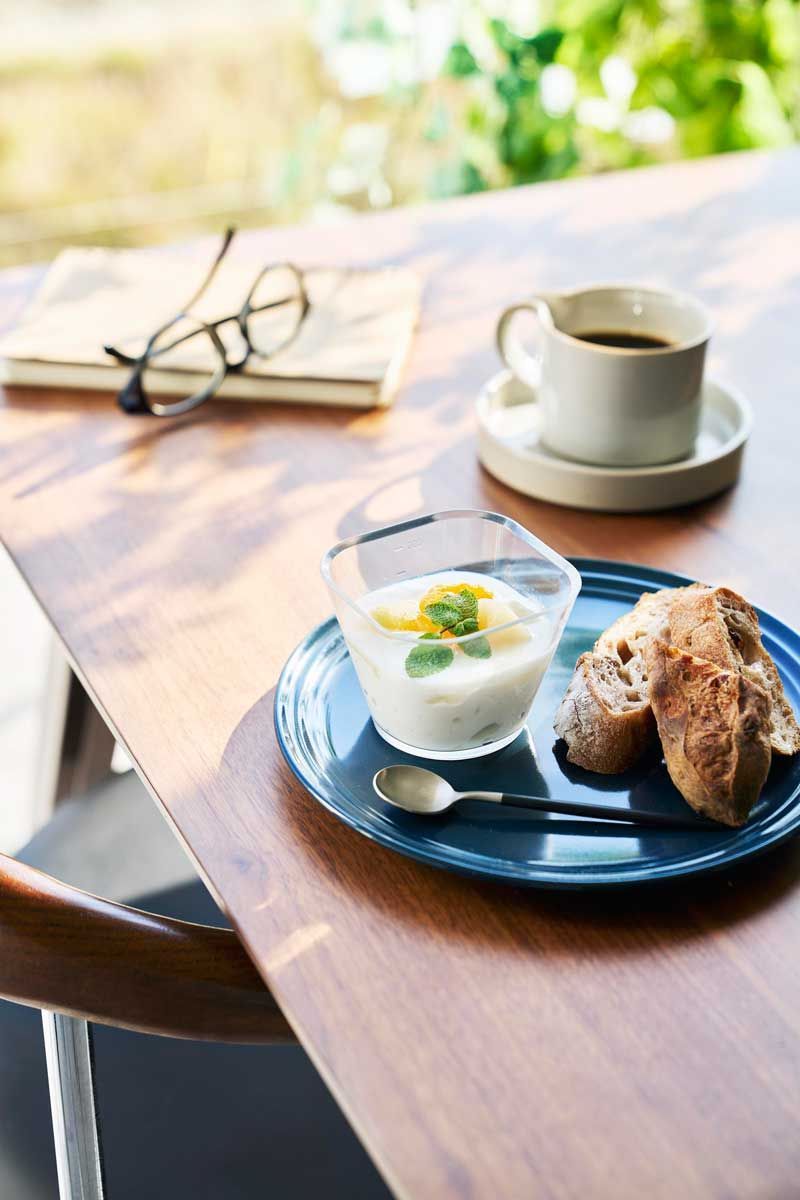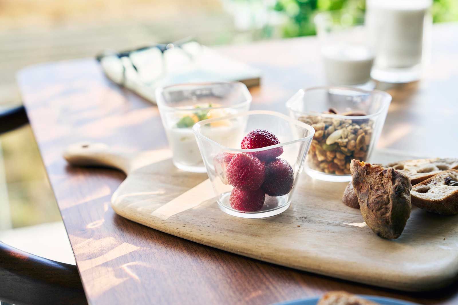 片手で持ちやすく注ぎやすい形状なので、自家製ドレッシング作りなどにもおすすめです。ガラスのような透明感で、食卓にそのまま器としても出せるデザインのボウルです。使わない時は重ねて収納できます。