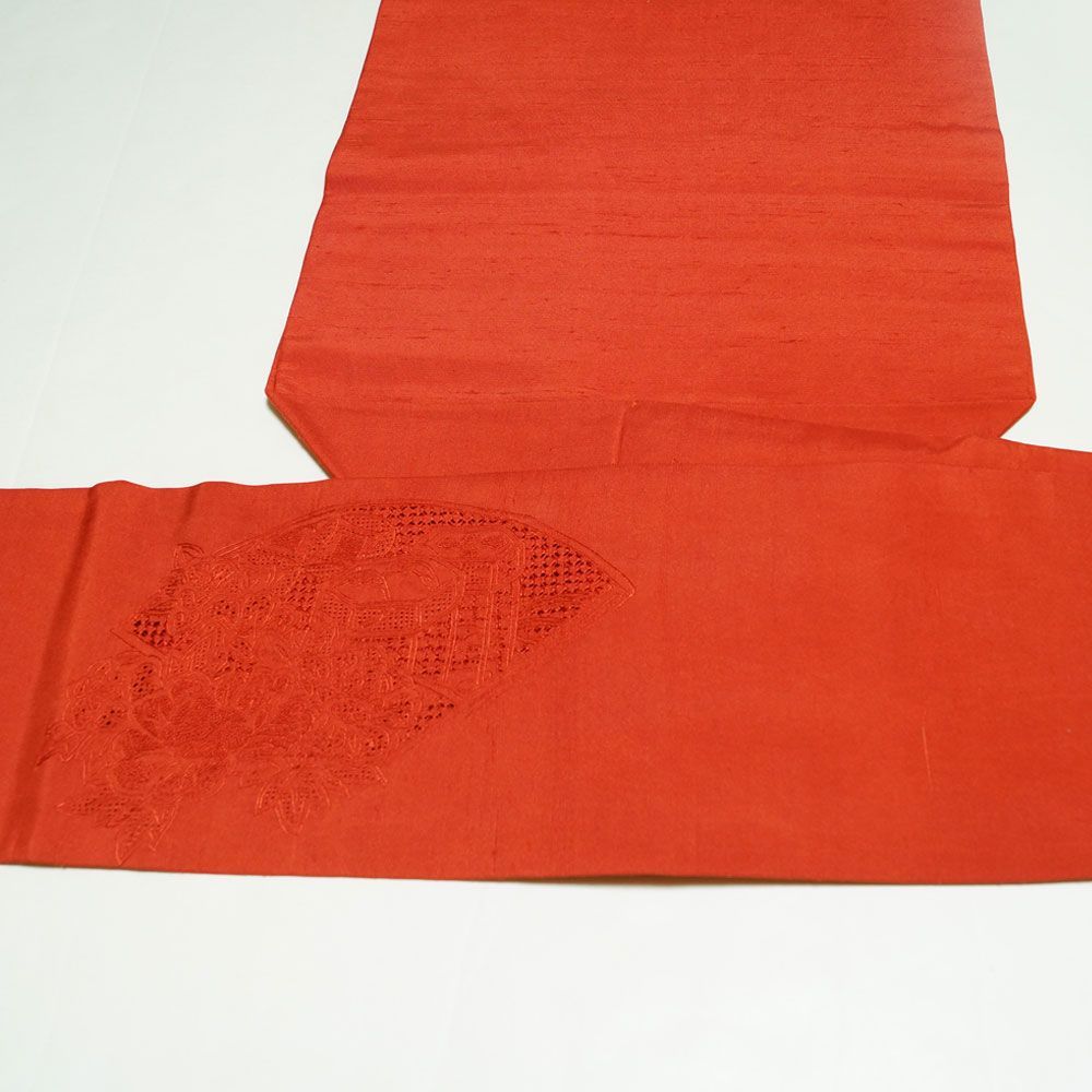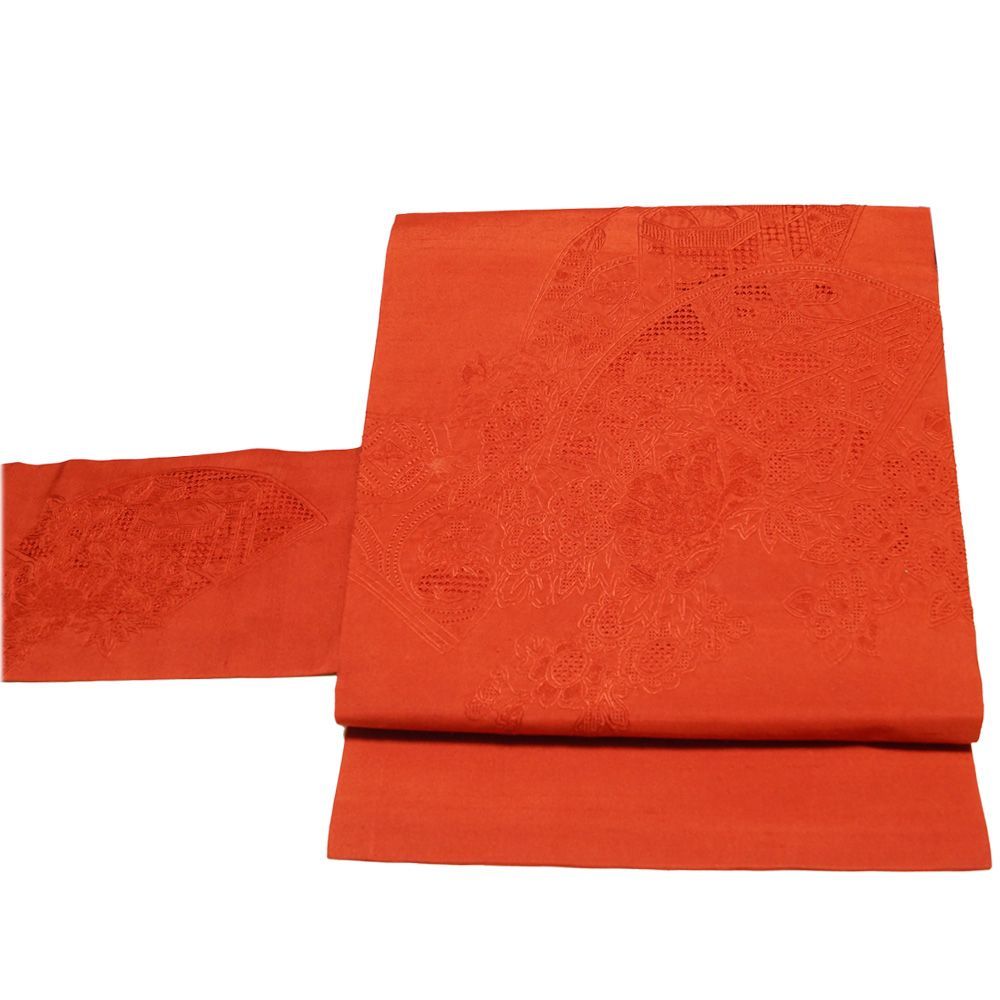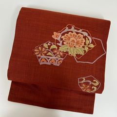 落ち着いた赤丹色系の紬地に地紙に百花、飛鶴、貝桶、七宝などの模様がスワトウ刺繍・相良刺繍にて施された名古屋帯です。
