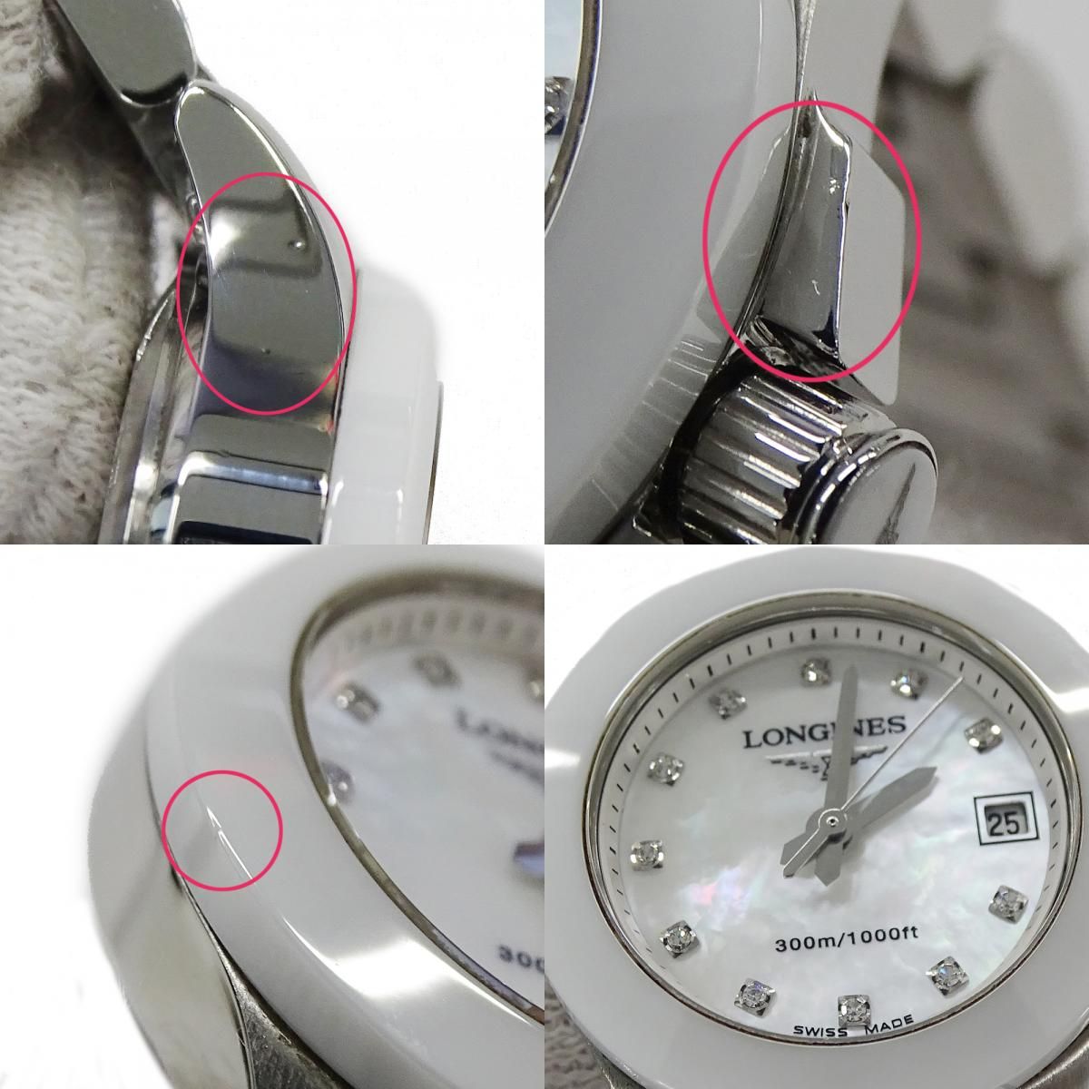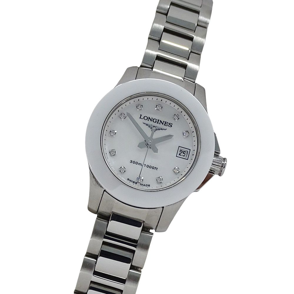 ロンジン LONGINES ハイドロ コンクエスト L3.157.4 時計 レディース ブランド 11P ダイヤモンド シェル デイト クオーツ QZ ステンレス SS ホワイトセラミック 磨き済み 【中古】