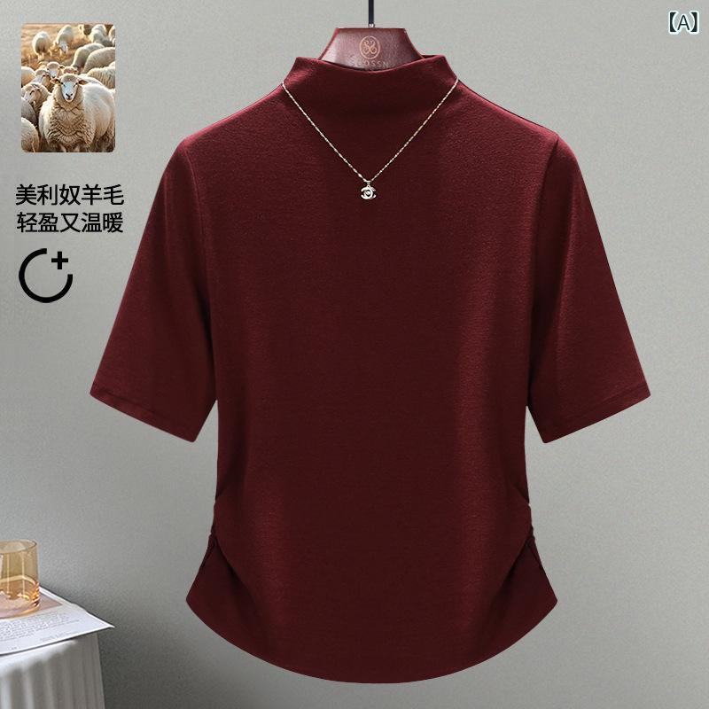 Tシャツ レディース 5分袖 2025年新作 トップス ニット 無地 ストレッチ サイドギャザー 半高ネック スリムフィット アンゴラレッド 白 黒 コーヒー 花灰色 レーヨン アクリル 通勤着