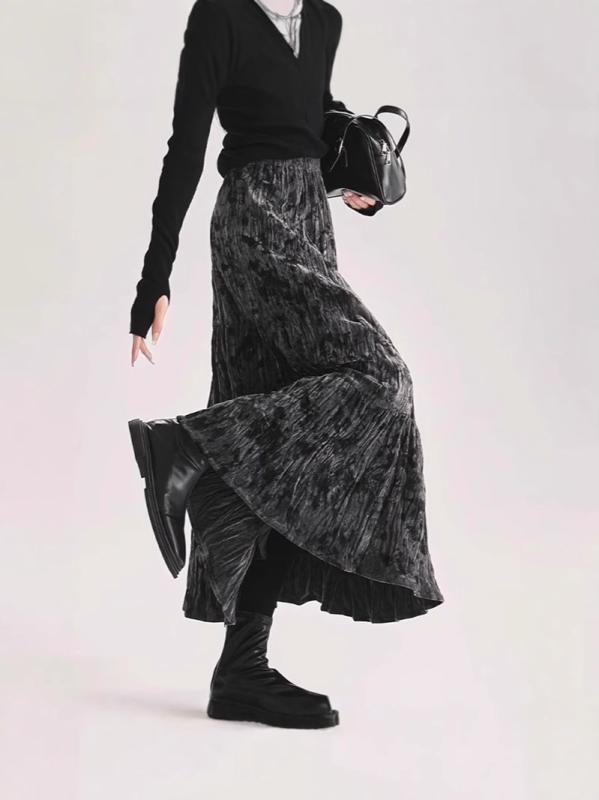 スカート レディース ファッション ハイウエスト 着痩せ 厚手 ベルベット プリーツ Aライン ミモレ丈 灰色 ポリエステル 通勤 オフィス