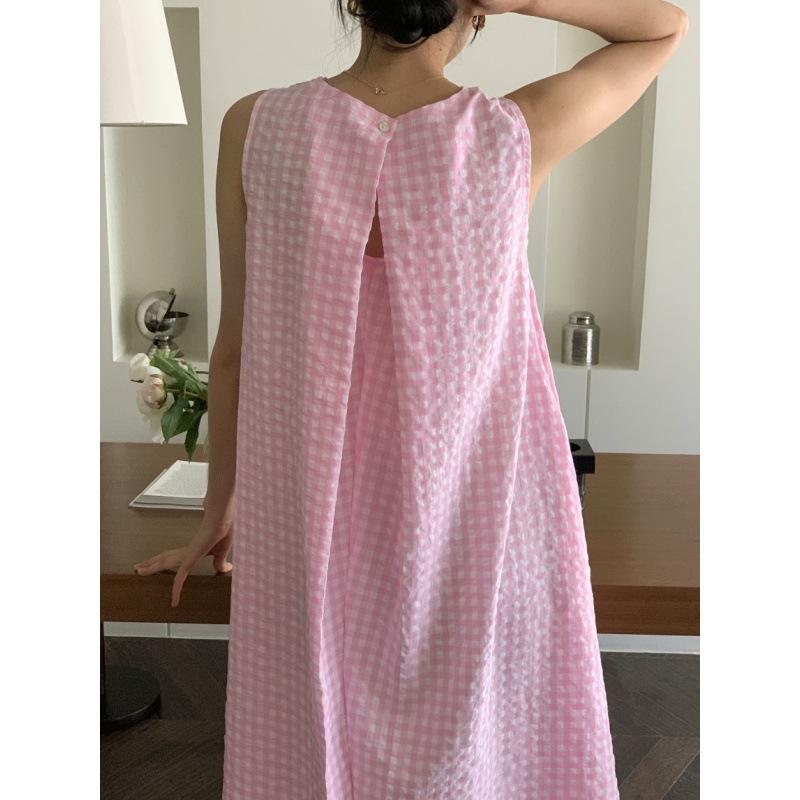 ワンピース レディース 麻 格子柄 ノースリーブ Aライン ロングワンピース ストリート カジュアル かわいい ピンク系 ブルー ブラック