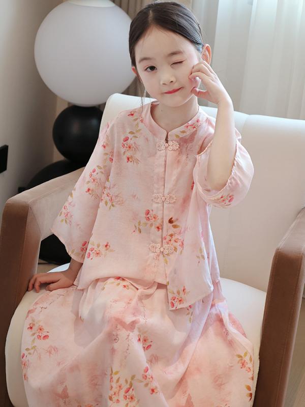 子供用チャイナドレス ガールズ 上下セット 春夏 綿 ピンク系 グリーン 中小童 女児 女の子 唐装 上着 スカート
